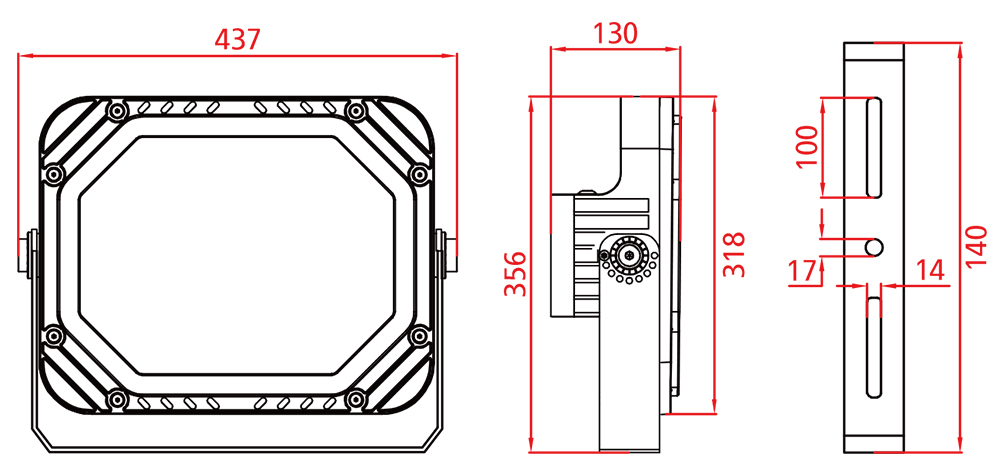 LED 사각 투광등 고와트급 DM-LFR0437_150W/200W 깔끔하고 고급스러운 느낌이 더해진 미려한 외관의 제품 유해물질이 포함되지 않은 에너지 절전형 친환경 제품 제품 이미지와 치수는 실물과 차이가 있을 수 있으며 외관과 사양은 고객사 협의 후 변경 가능 뒤로가기 drawing specification Model No. Power Voltage Color Rendering Size(mm) DM-LFR0437_150W 150W DC 24V White Mono Color RGB Full Color 437 X 356 X 130 DM-LFR0437_200W 200W DC 24V White Mono Color RGB Full Color 437 X 356 X 130 뒤로가기